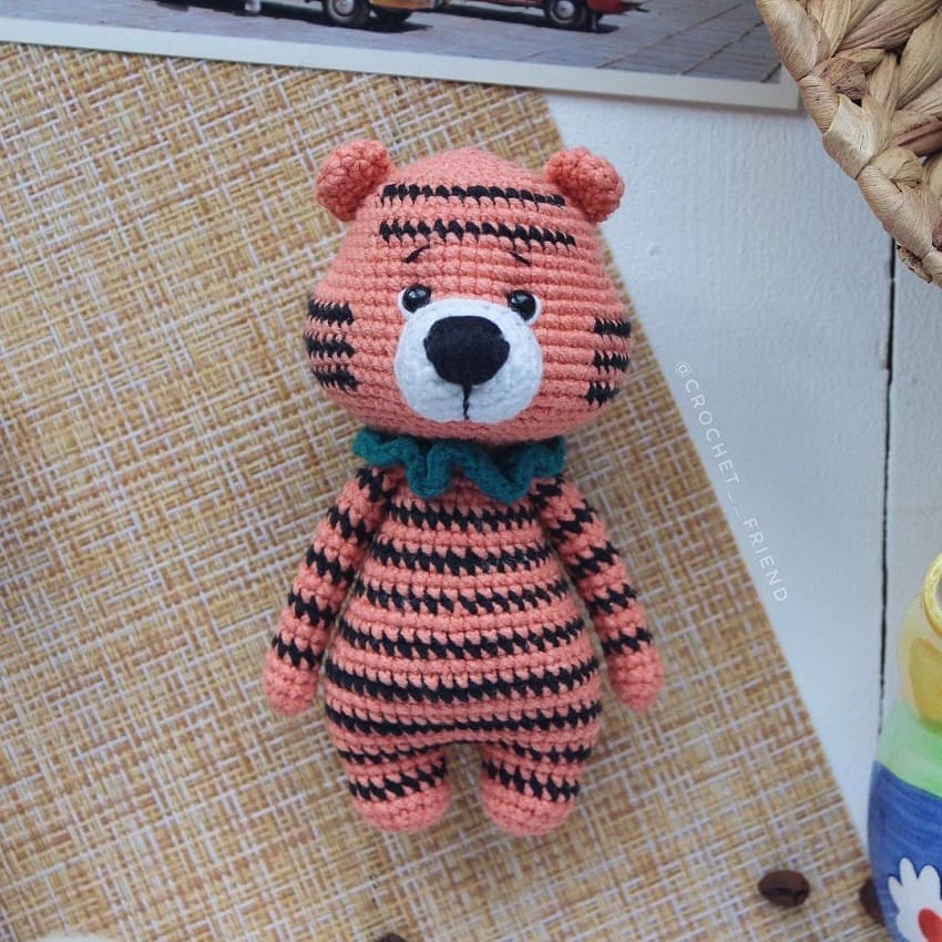 Уделите внимание деталям: узору мордочки, лапкам и ушкам. Они придают тигру живой вид. Используйте разные цвета пряжи для деталей и подчеркните их контур аккуратной вышивкой.